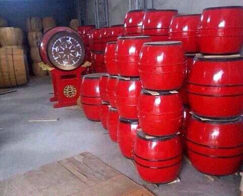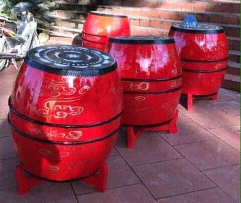 Chất liệu: Thân trống gỗ mít sơn đỏ vẽ mây, mặt trống da trâu in hoa văn